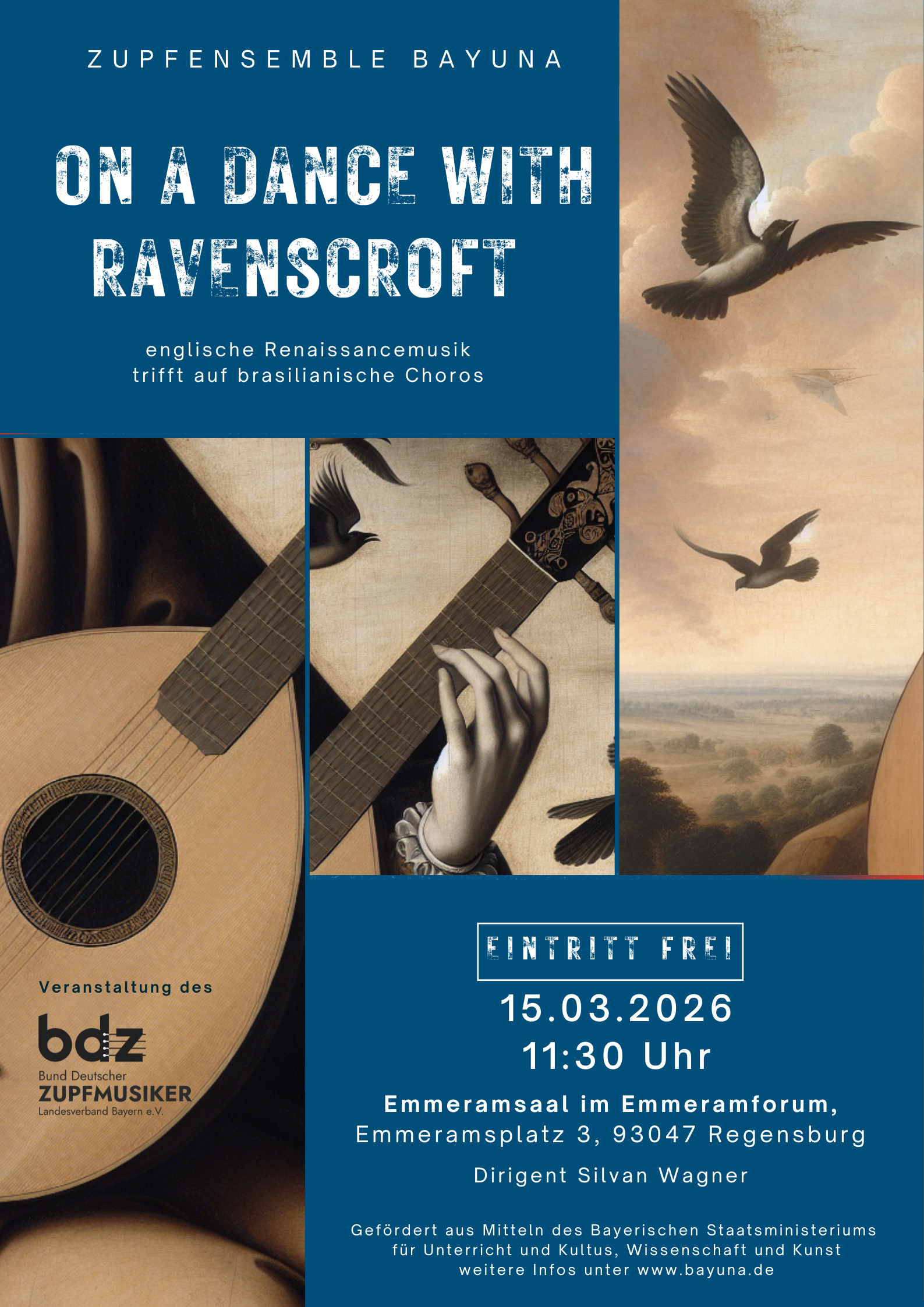 "On a dance with Ravenscroft and more" - das aktuelle Programm lebt von der reizvollen Spannung zwischen Renaissancemusik und südamerikanischem Chorro. In seinen Singbüchern hat Thomas Ravenscroft im England des ausgehenden 16. Jahrhunderts kleine vokale Kostbarkeiten geschaffen, deren luzide Polyphonie sich ideal für Zupfinstrumente eignet. Die modernen Chorros hingegen entfalten ihre Wirkung durch mitreißende Tanzrhythmen und eine farbenreiche,  romantisch geprägte Harmonik. Verbunden werden beide Klangwelten durch ihre Nähe zum jeweiligen Volksliedton, der musikalische Raffinesse mit unmittelbarer Lebendigkeit und Unterhaltsamkeit vereint.